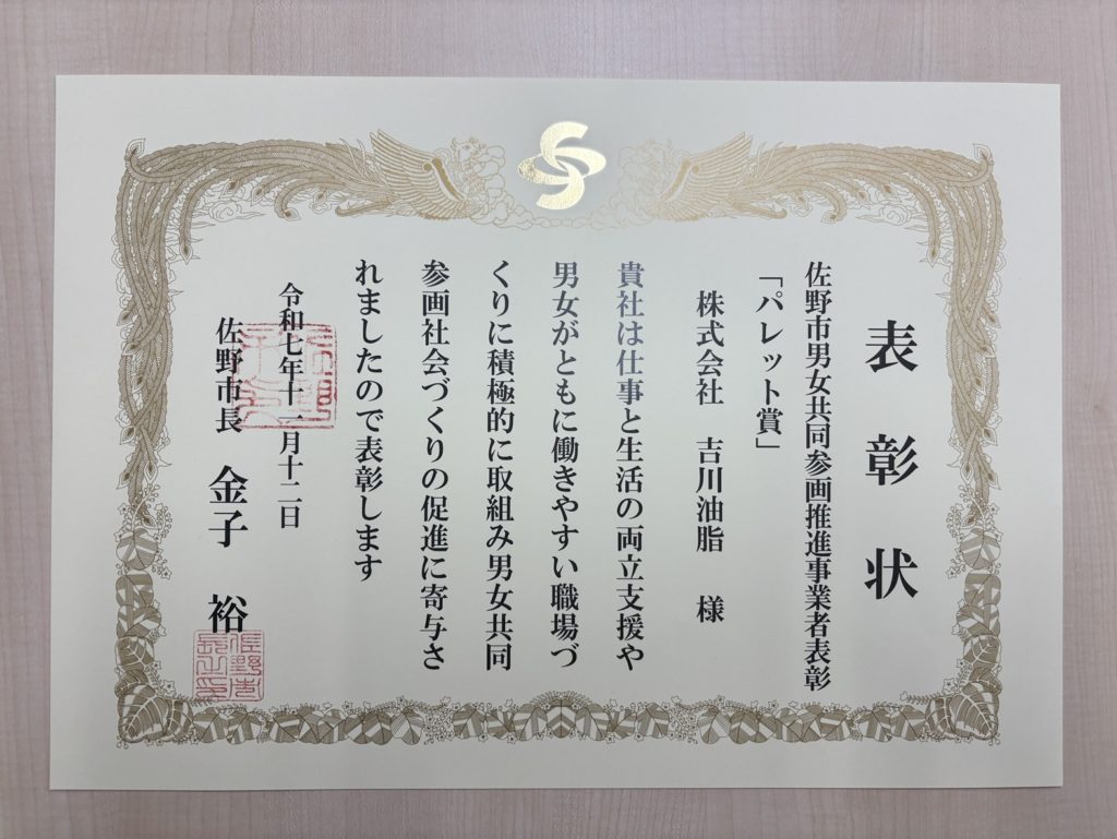 男女共同参画推進事業者表彰「パレット賞」受賞しました