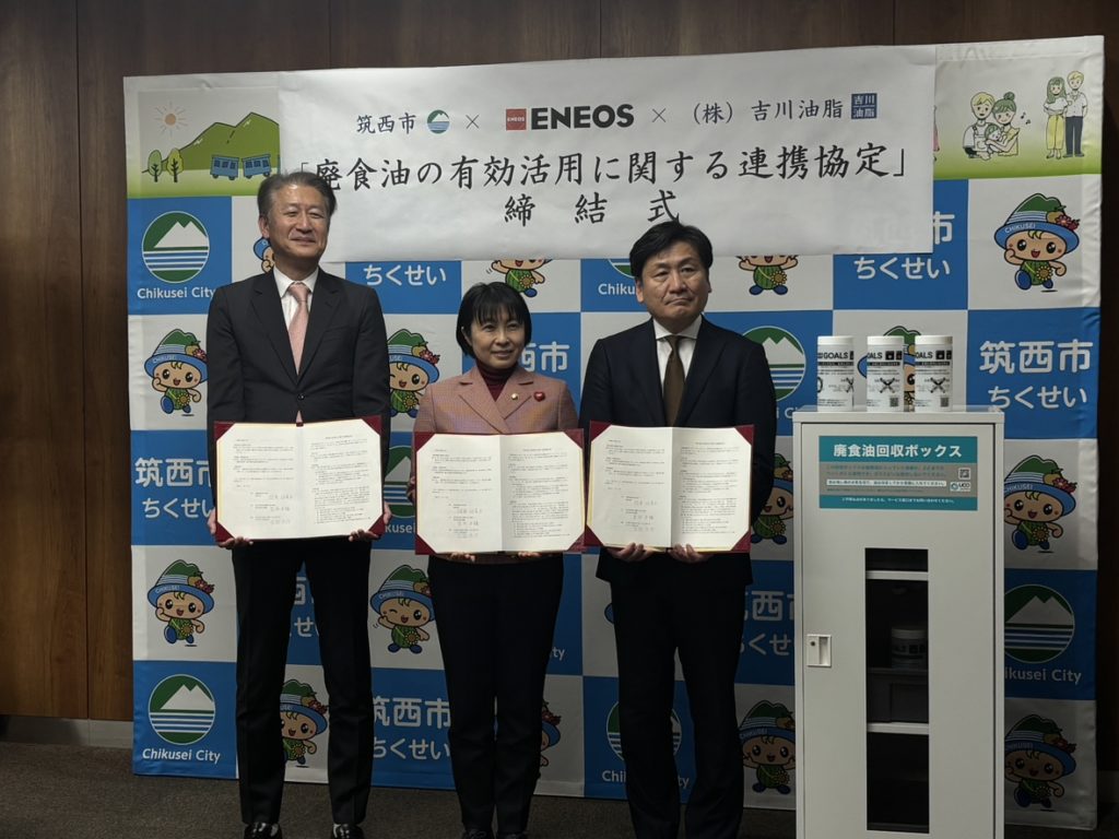弊社、筑西市様、ENEOS株式会社は、「持続可能な資源循環社会の実現に向けた廃食油の回収及びリサイクルに関する協定」を締結いたしました。