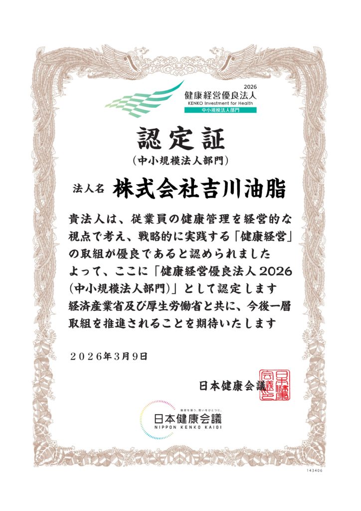 この度、吉川油脂は経済産業省が創設した「健康経営優良法人認定制度」の